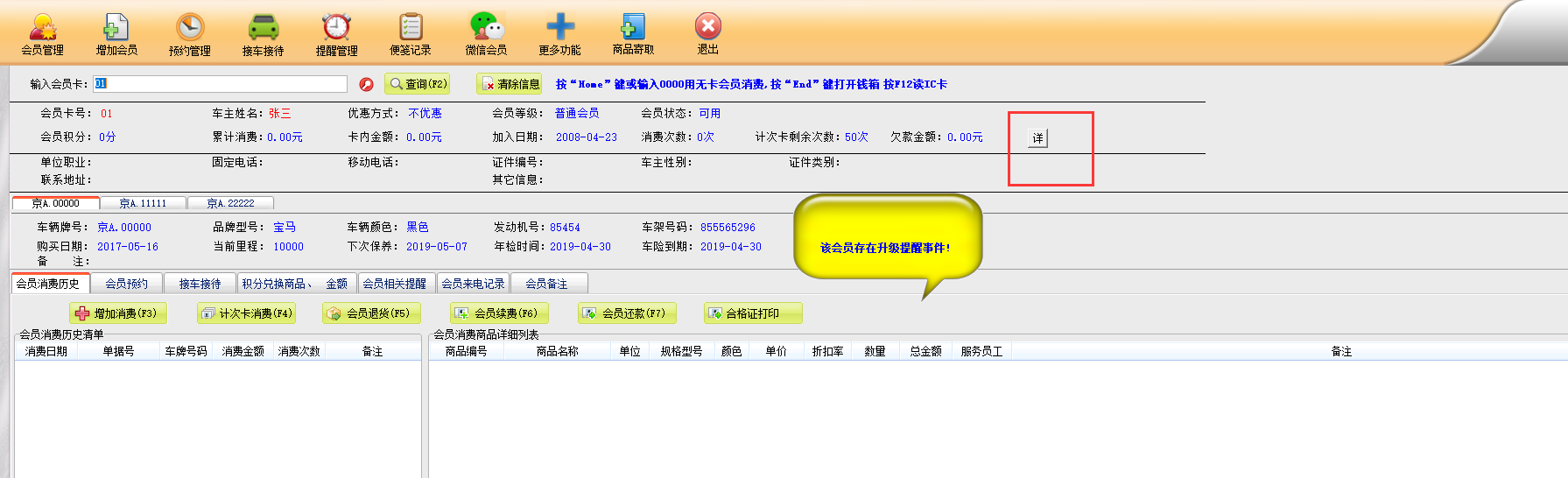 美萍汽车服务行业管理软件,如何知道会员卡现在卡里还有剩余什么项目?